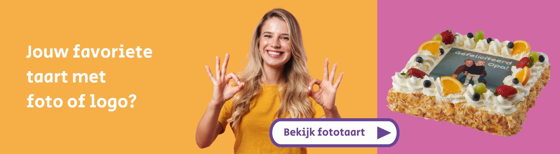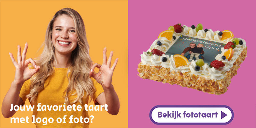 Wil je jouw taart extra persoonlijk maken? Bestel dan een fototaart met een persoonlijke foto en/of leuke tekst. Met onze handige Plaatjesmaker© ontwerp je snel en simpel je eigen fototaart. Ook voor bedrijven bieden we de mogelijkheid om een logotaart te bestellen.